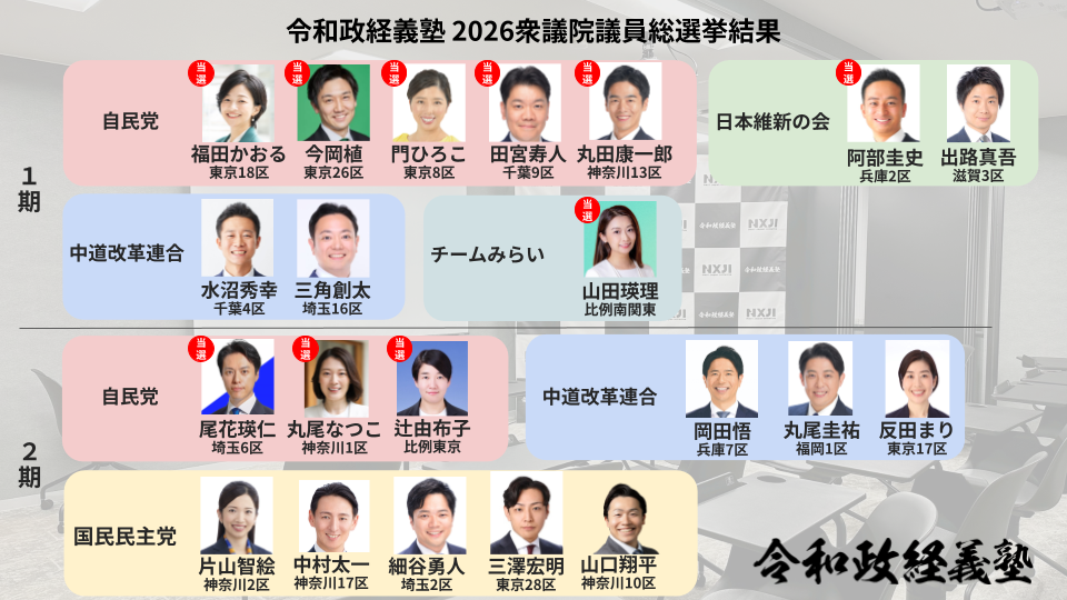 今回の選挙においては令和政経義塾関係者94名から、超党派で21名が立候補し10名の当選という結果になりました。21名のうち、8名が自民党、2名が日本維新の会、5名が中道改革連合、5名が国民民主党、1名がチームみらいからの出馬であり、まさに我々の「超党派の政治塾」を体現する挑戦でした。